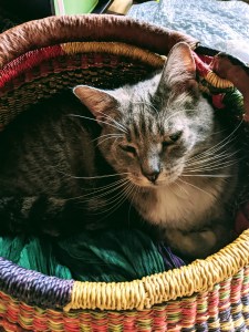 Dark tortoiseshell, born fall of 2020. She’s the shyest one, you might not see her. Very soft and sweet. She was a stray who came in from the cold “just until we can get her fixed.” Yep. Her favorite thing is her jingly collar, and she assumes that anything else with a bell is her friend.